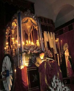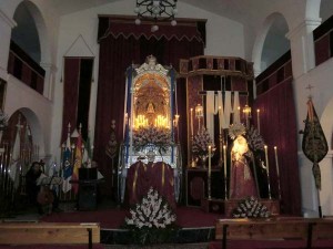 Nuestra Capilla, espectacularmente adornada para la ocasión, lucia la cruz de carey de Nuestro Padre Jesús del Calvario y una imagen de la Virgen María dolorosa del imaginero Elías Rodríguez Picon, de culto particular, presidían junto a nuestro Simpecado el altar durante la Exaltación.