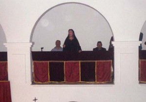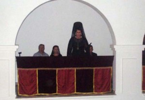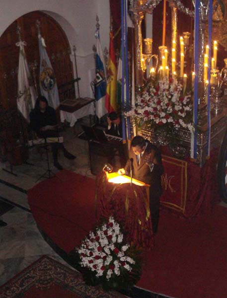 Mientras sonaban los sones de la marcha ‘La Madrugá’ en el piano de David López y José Carlos Roca, al violonchelo, nuestra secretaria, Lola Saavedra, ataviada de mantilla como presentadora abrió el acto. Mientras en nuestra capilla se encontraba salpicada de mujeres de Mantilla negra para realzar más este acontecimiento.